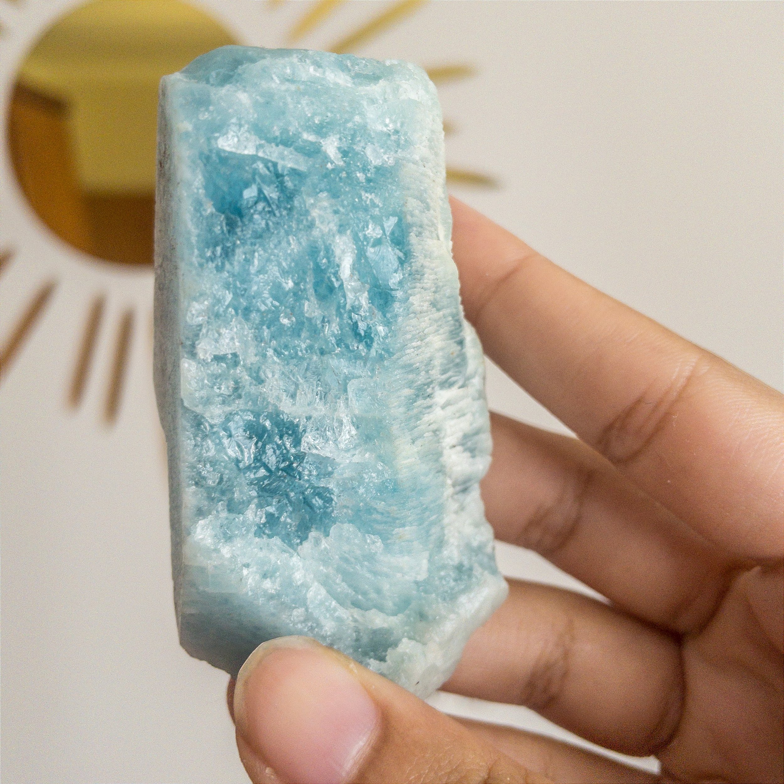Pedra da coragem, auxiliam na calma e no estresse e aquieta a mente. Ela harmoniza o seu ambiente ao redor e protege contra os poluentes. Nos tempos antigos acreditavam-se que a água marinha combatia as forças das trevas e obtinha favores dos espiritos de luz.