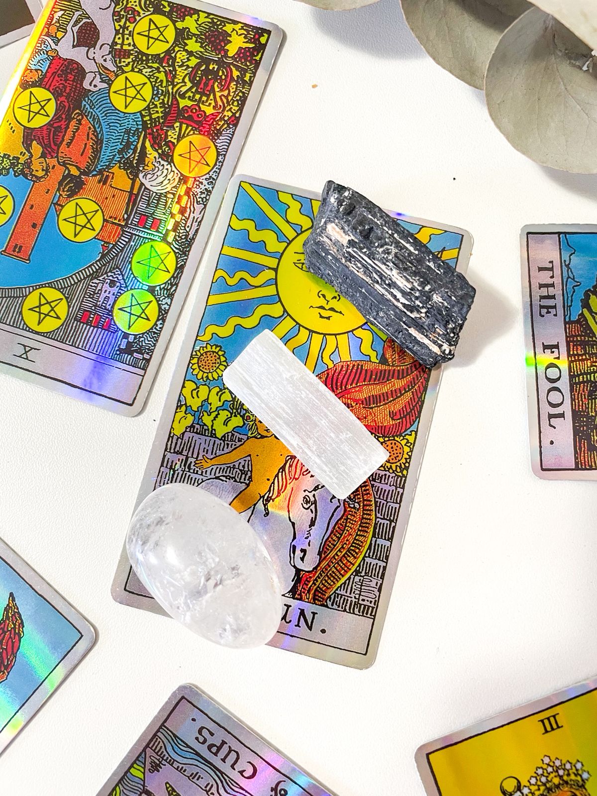 Apresentamos o Kit Essencial de Blindagem e Purificação para Tarólogos. Três guardiões de cristal selecionados para manter seu campo vibracional intacto.