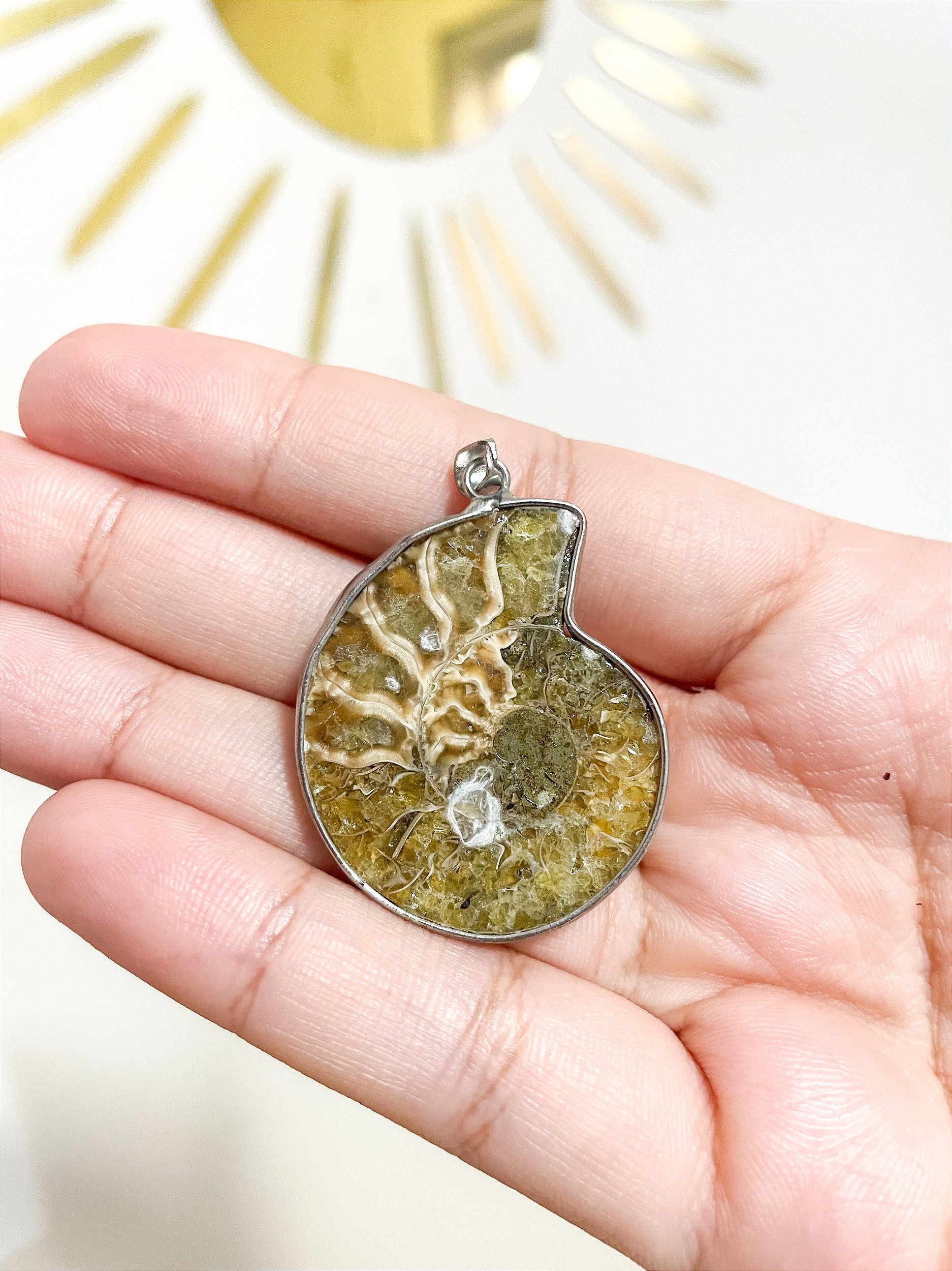 Cada pingente é único, exibindo as câmaras fósseis com detalhes hipnotizantes. A peça é cuidadosamente polida e montada em um acabamento de alta qualidade para ser usada diariamente, permitindo que a energia do fóssil esteja sempre próxima ao seu coração.