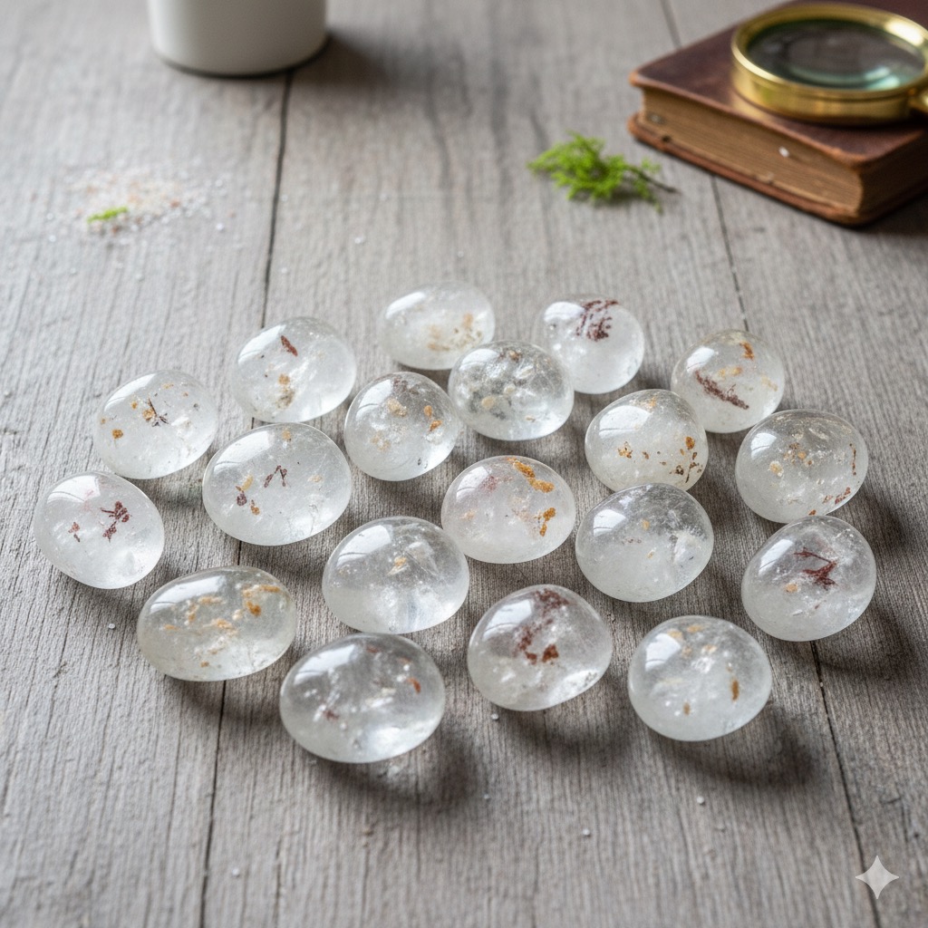 Descubra o universo interior do Quartzo Xamânico. Também conhecida como Lodolita ou Garden Quartz, esta pedra rolada é 100% natural e foi polida para revelar suas impressionantes inclusões internas.